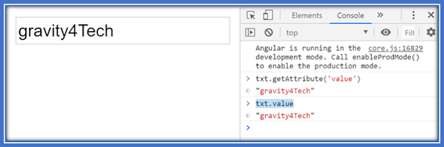§ If I inspect this element and then in the console type txt.getAttribute('value') represents the textbox element whose id is ‘txt’ which is the input element. txt.getAttribute('value') we can see gravity4Tech.similarly if we type txt.value we can see again gravity4Tech.